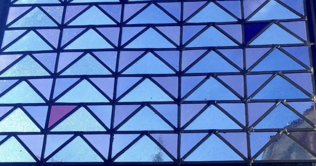 On marchait pour se rendre dans un restaurant et illumination !!! Dans une vieux magasin il y avait un vitrail bleu avec des triangles exposé. J’ai dit aux autres de s’arrêter et je suis retournée sur quelques mètres en arrière et j’ai pu admirer ce magnifique vitrail.